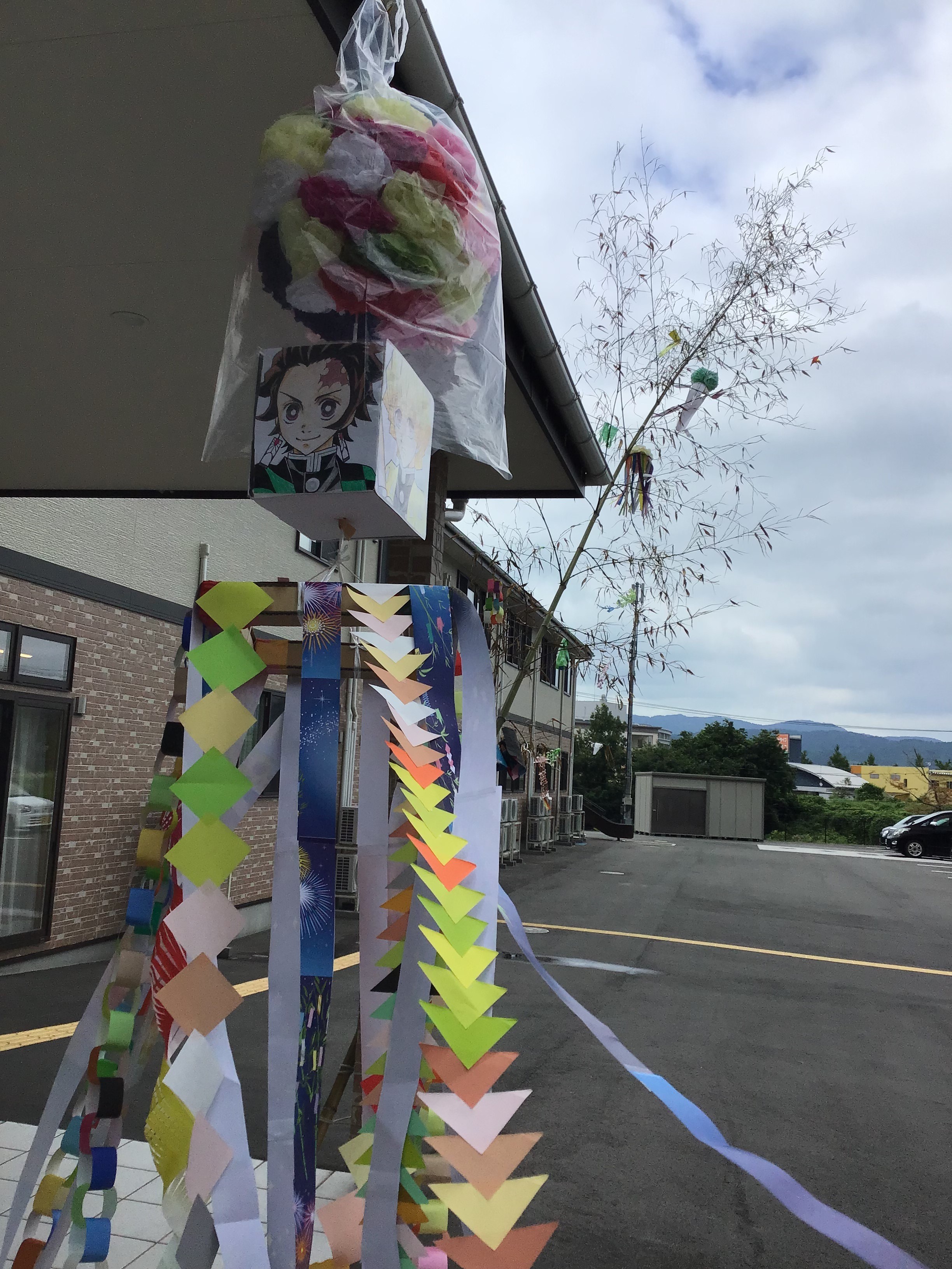 あいにく梅雨真っただ中で天気の悪い日が続き、飾りをつけては雨風で取れつけては取れて・・・といった感じでしたが、利用者様も笹を眺めて喜ばれておりました!(^^)!