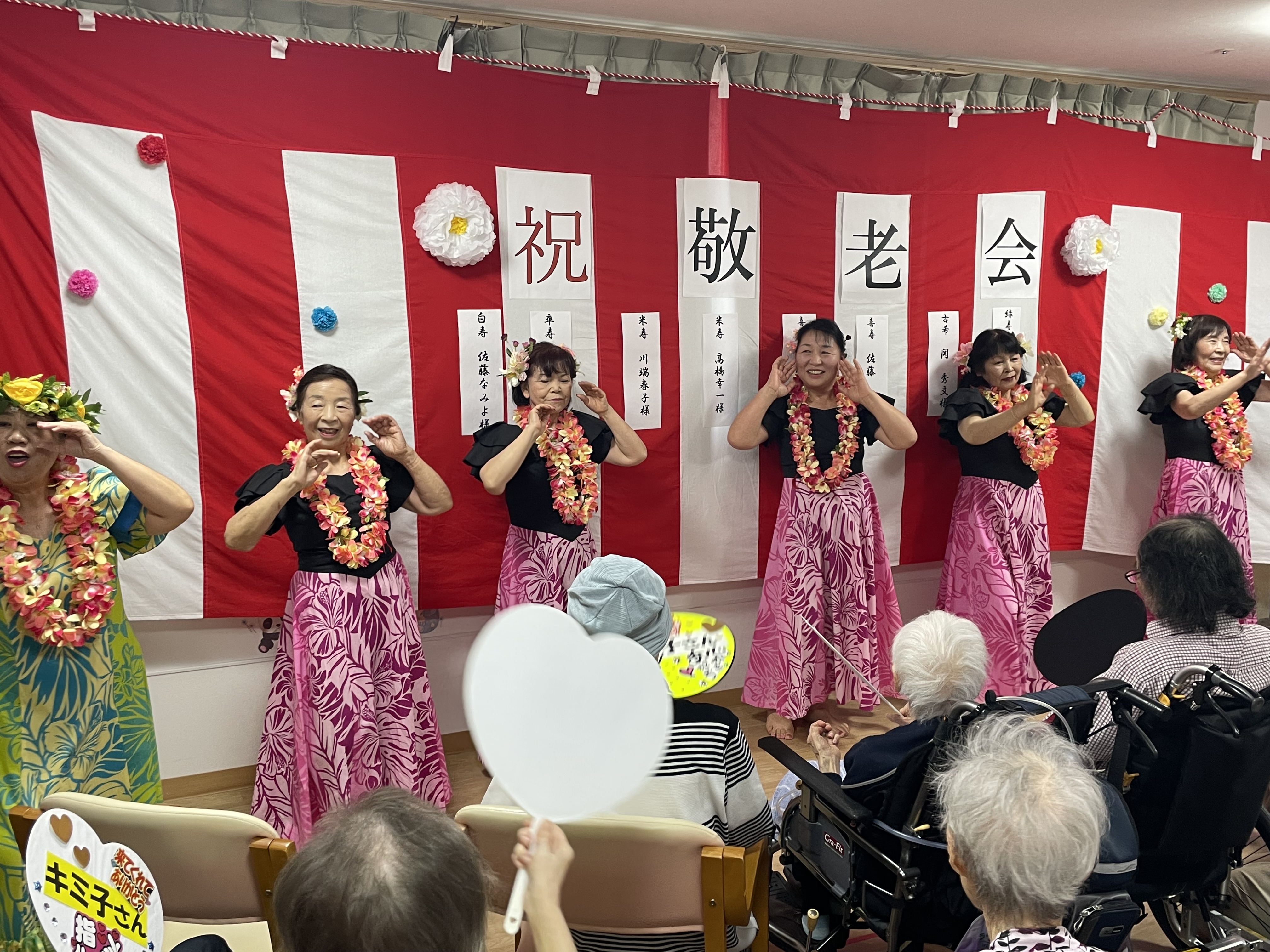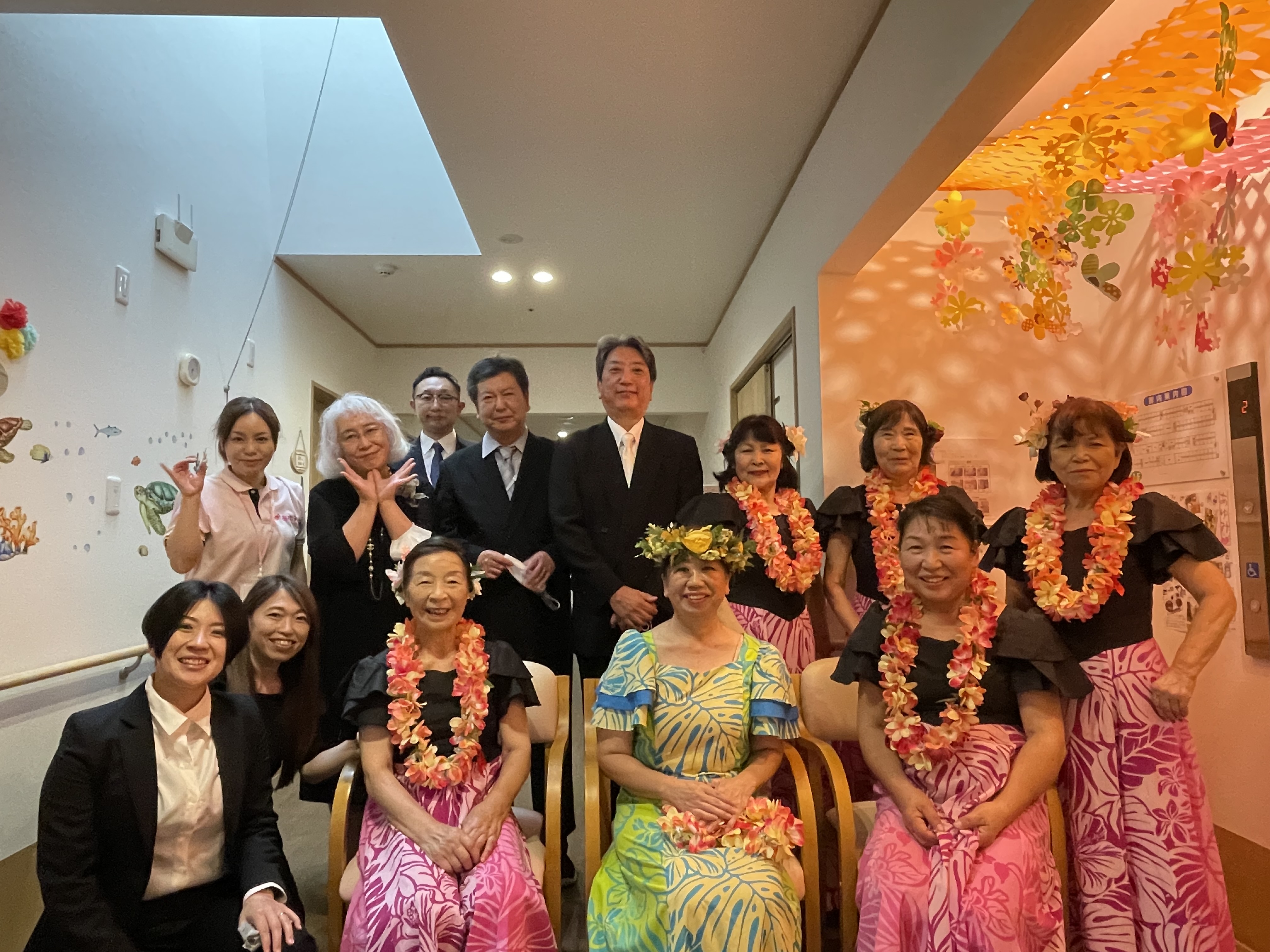 会場では、グレーシャスクラスの皆様がフラダンスを披露してくださり、華やかな舞に拍手が絶えませんでした。さらに、ご利用者様によるギター演奏と歌声、また謡曲のご披露もあり、多彩なプログラムとなりました。