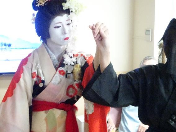 舞妓さんも黒子さんも職員が仮装し、石川さゆりさんの『天城越え』の曲に合わせながら踊りを披露されました。アンコールもあり、非常に盛り上がった余興でした(^^♪
